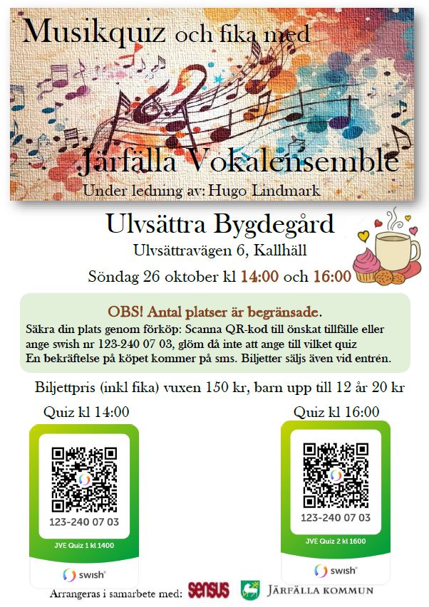 Söndagen den 26 Oktober 2025, ordnar vi med Quizcafé i Ulvsättra bygdegård (Kalhäll).